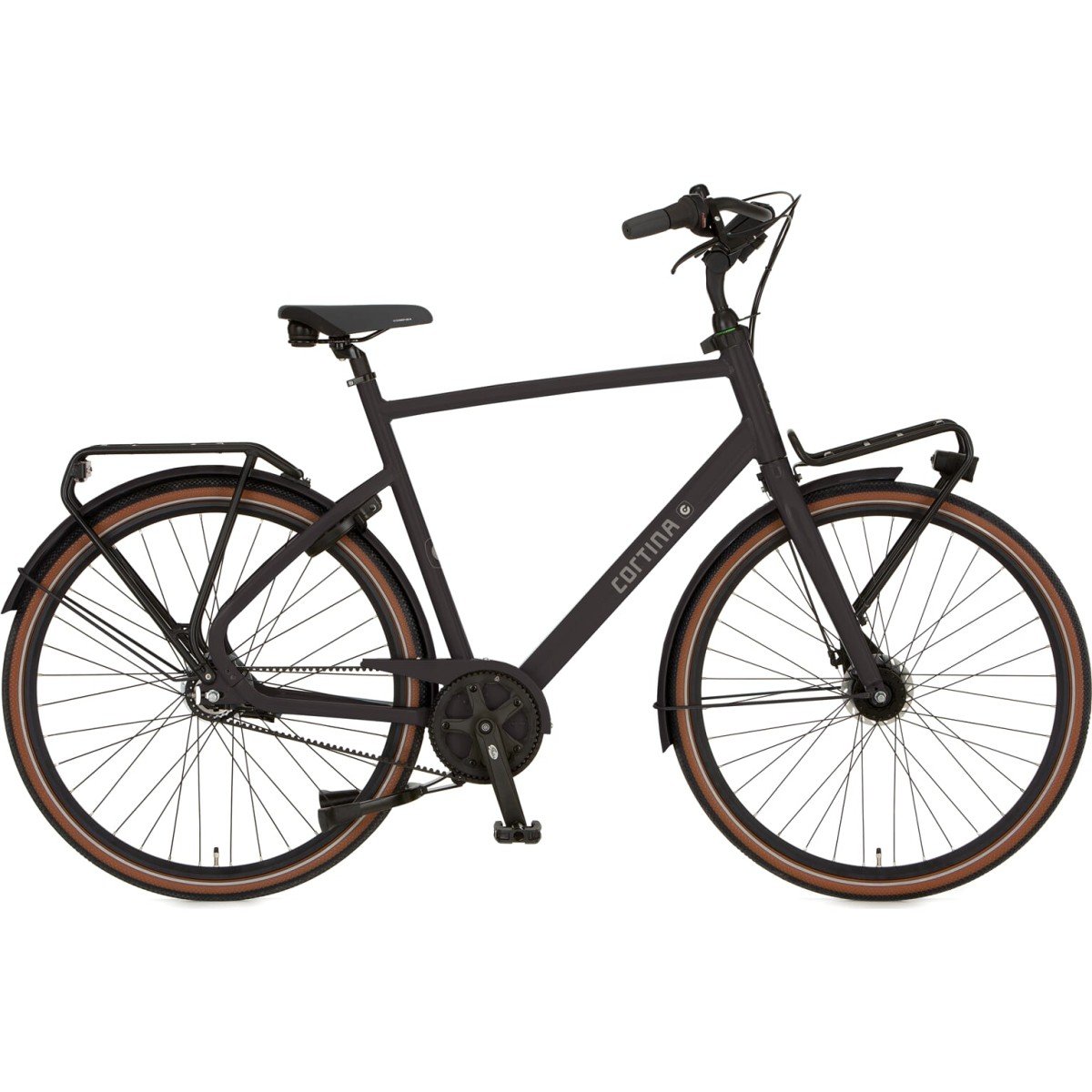 Cortina Common herenfiets in framemaat 56cm. Kleur: Demitasse Matte. Uitgerust met achter een Shimano Nexus 7-traps versnellingsnaaf met rollerbrake en voor een Shimano naafdynamo met rollerbrake. Gates Belt Drive – type CDN. Opvallende details: aluminium frame, stuurslot, voordrager. Kleurnummer: PRDW 00307 Matte.