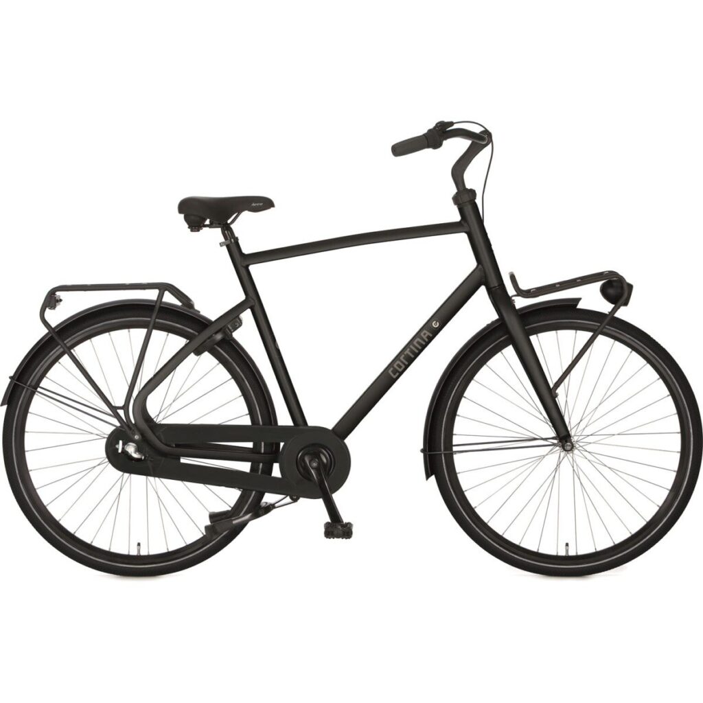 Cortina Common herenfiets in framemaat 56cm. Kleur: Jet Black Matte. Uitgerust met achter een Shimano Nexus 3-traps versnellingsnaaf met terugtraprem en voor een standaard naaf. Opvallende details: aluminium frame, stuurslot, voordrager.�Kleurnummer: UZZ 69005 Matte.