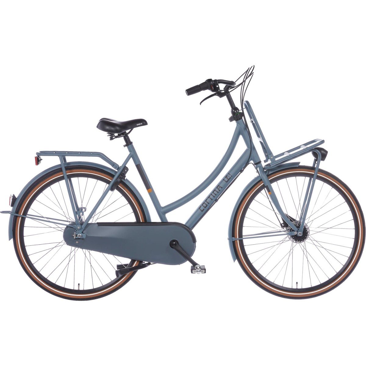 Cortina Transport U4 Solid damesfiets in framemaat 57cm. Kleur: Mouse Grey Matte. Uitgerust met achter een Shimano Nexus 7-traps versnellingsnaaf met rollerbrake en voor een Shimano naafdynamo met rollerbrake. Opvallende details: aluminium frame, stuurslot, voordrager. Kleurnummer: UGSW 77545 Matte.