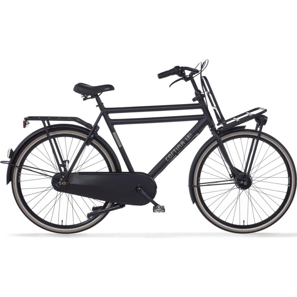 Cortina Transport U4 herenfiets in framemaat 50cm. Kleur: Jet Black Matte. Uitgerust met achter een Shimano Nexus 7-traps versnellingsnaaf met rollerbrake en voor een Shimano naafdynamo met rollerbrake. Opvallende details: aluminium frame, stuurslot, voordrager. Kleurnummer: UZZ 69005 Matte.